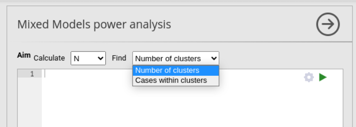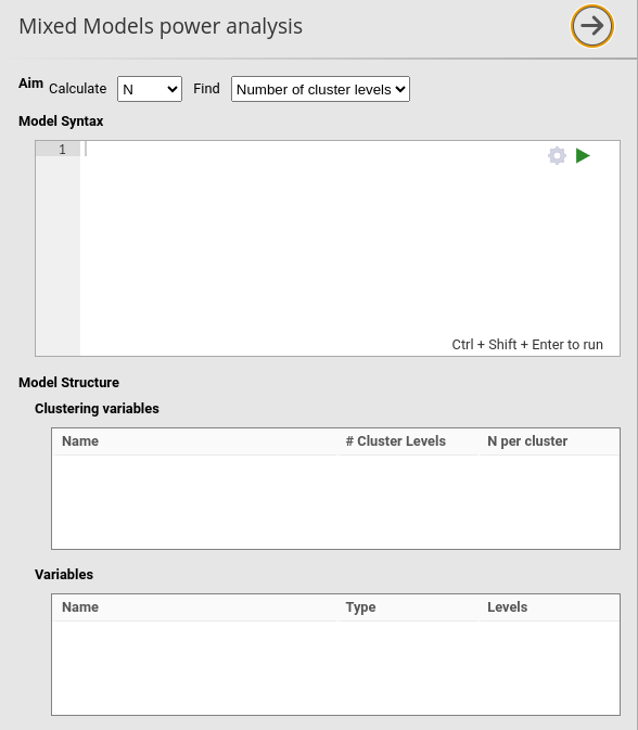 As opposed to other modules and command in jamovi, the power analysis for mixed models does not update the results whenever an option is changed in the UI. This is because power analysis simulation algorithm may take very long time to achieve an estimation, thus blocking the user work when setting several options. Thus, to run the analysis the user should always click the ▶ run button.