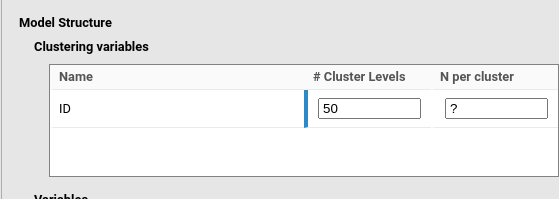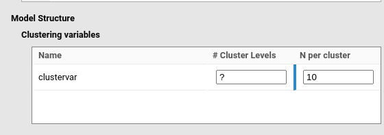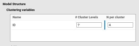 In PAMLj, grouping variables are referred to as clustering variables, the number of clusters (or groups) as # Clusters levels, and the number of observations per cluster as N per cluster.