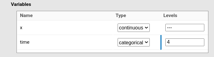 If a variable is categorical, it should be indicated in the panel and the number of levels of the variable needs to be specified. In the figure, \(z\) is considered as categorical with 4 levels.